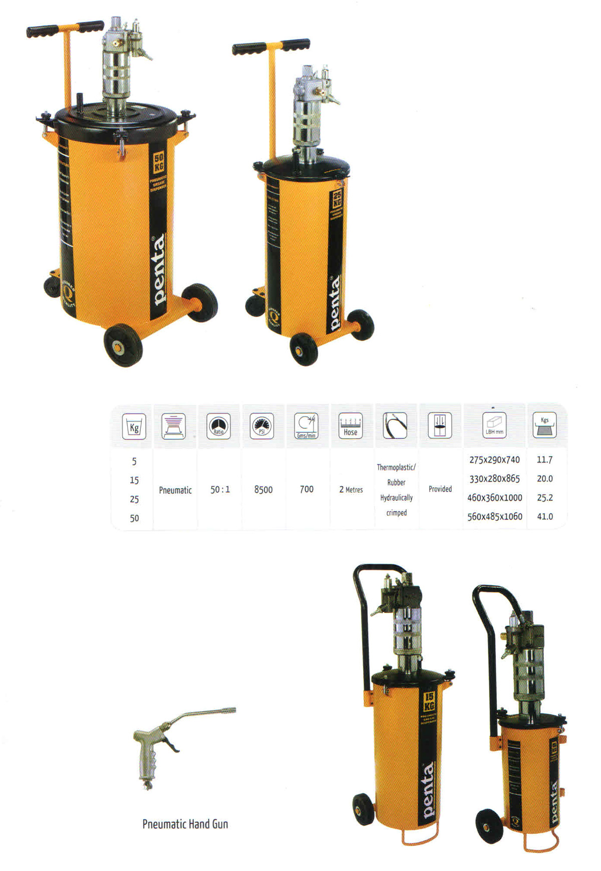 Pneumatic Grease Dispensers of capacity 25Kg & 50Kg. The greasers are provided with castors for easy mobility and the swivel arrangement for hose help in easy handling with little efforts. The anti - airlock pressure plates ensure easy flow of grease. The product meets the highest standards in quality and comes in powder coated finish with all the external components nickel plated for longer life.