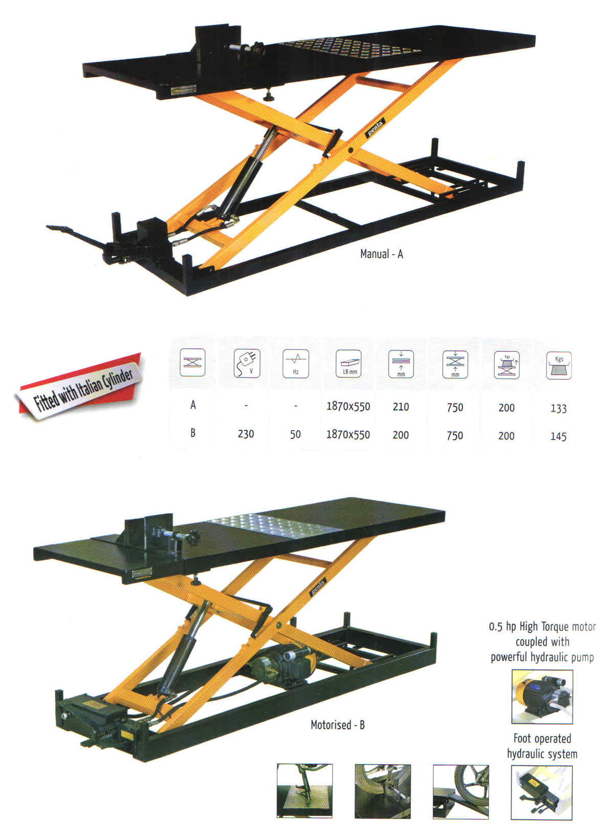 The most economical yet sturdy Hydraulic Ramp for Two Wheelers. Made of mild steel powder coated tubular sections, scissors lifting arrangement with locking system ensures smooth and safe operation. The foot operated Hydraulic system meets the highest quality standards with hard chrome plated piston and burnished cylinder. The ramp can be operated with little effort, does not require electrical power and can be easily shifted any where within the shop floor. Easy loading platform, aluminium checkered plate for stand portion and adjustable front wheel locking system meets the entire requirement of the customer. The Hydraulic system requires very minimum maintenance.